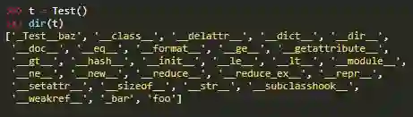 如果你仔细观察,你会看到此对象上有一个名为_Test__baz的属性。 这就是Python解释器所做的名称修饰。 它这样做是为了防止变量在子类中被重写。