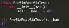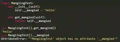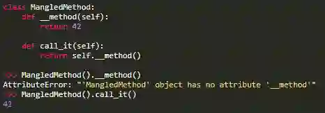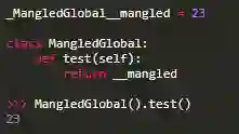 在这个例子中,我声明了一个名为_MangledGlobal__mangled的全局变量。然后我在名为MangledGlobal的类的上下文中访问变量。由于名称修饰,我能够在类的test()方法内,以__mangled来引用_MangledGlobal__mangled全局变量。