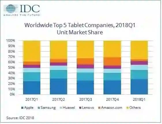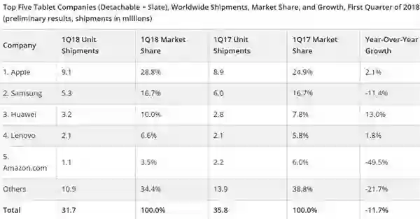 华为排名第三,该季度平板电脑出货量增加了40万部,市场份额增加2.2个百分点至10%。联想出货量保持在210万部,份额增加0.8个百分点。亚马逊出货量则大跌49.5%,份额从上年同期的6%跌至3.5%。