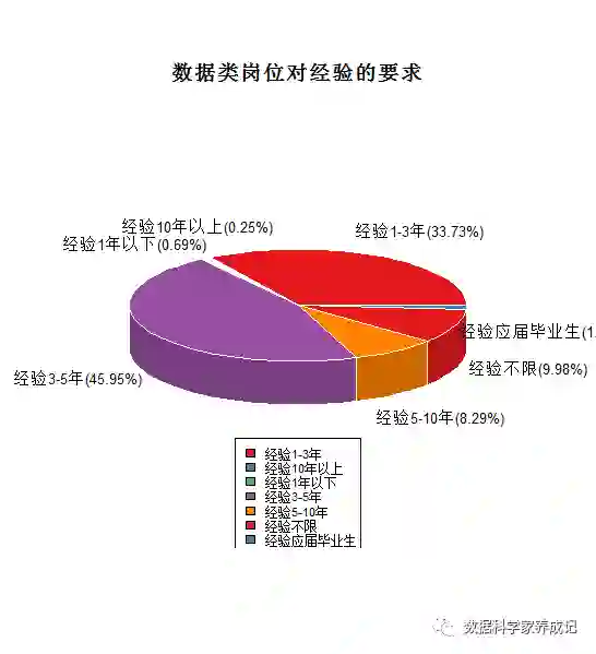 一个大家都乐意知晓的事实是,数据类岗位薪资通常都会有一个较高的起薪,高学历、零经验的应届毕业生拿到10K的薪资几乎已成常态,个别能力强的一段时间后拿到20K到30K的也大有人在。就数据行业而言,经验1-3年和3-5年是行业的香饽饽,数据分析与数据挖掘在国内兴起时间不长,很难有资深的数据科学从业者,经验5-10年就已可遇不可求,10年以上经验的业界大咖更是凤毛麟角。