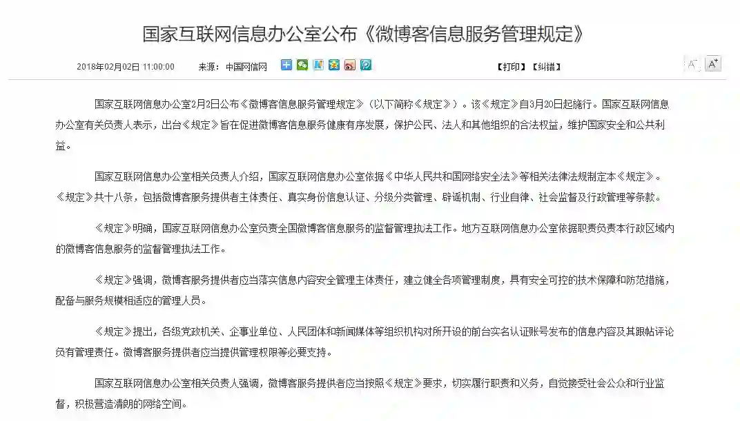 一是《微博客信息服务管理规定》,3月20日起施行,含有微博客服务提供者主体责任、真实身份信息认证、分级分类管理、辟谣机制、行业自律、社会监督及行政管理等条款。