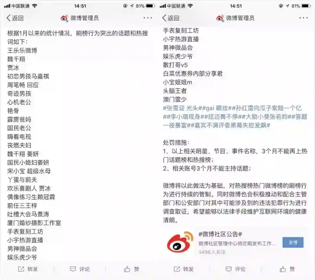 2月1日,微博发布“11~12月违规涨粉账号处理公告”和“关于新星榜数据异常的公告”。