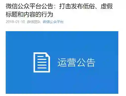 1月10日,微信公众平台发布公告,称要打击发布低俗、虚假标题和内容的行为。