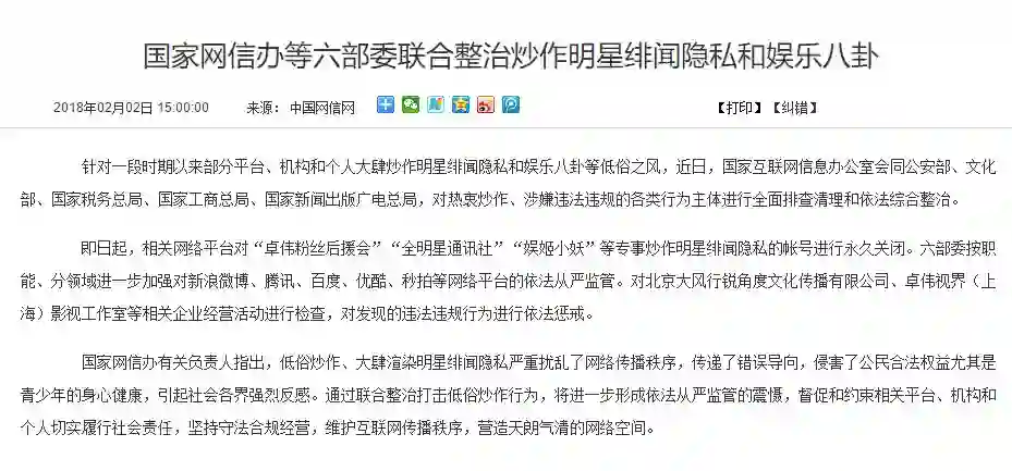 二是国家网信办等六部门联合整治炒作明星绯闻隐私和娱乐八卦。