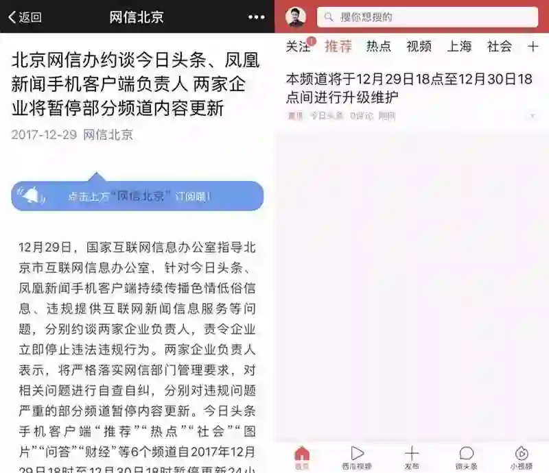 2017年底最后三天,今日头条和凤凰新闻手机客户端被北京网信办约谈,违规问题严重的部分频道暂停内容更新。