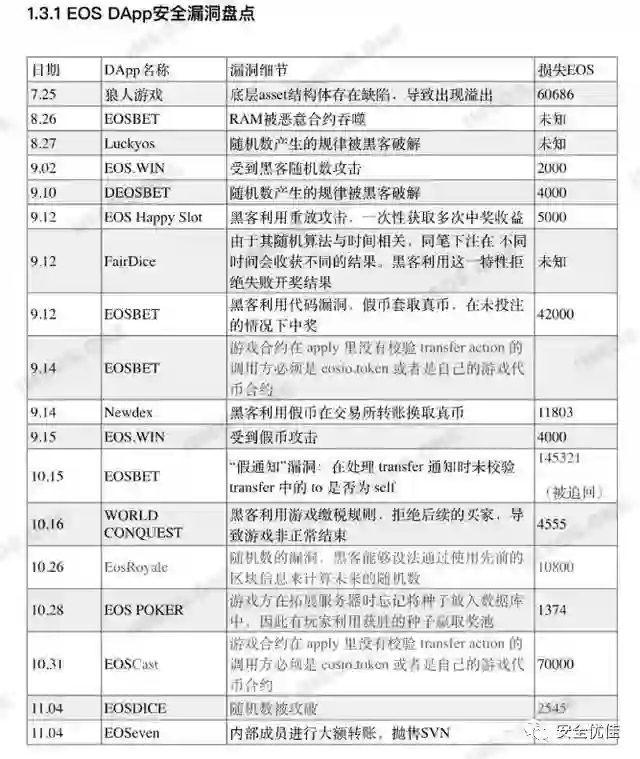 专注EOS生态的网站IMEOS联合百家媒体在11月初发布了一份《EOS平台DApp生态数据分析报告》,对EOS DApp的安全漏洞进行了一个盘点。四个月时间,发生了18起安全漏洞事件,EOS总的损失规模达上千万。