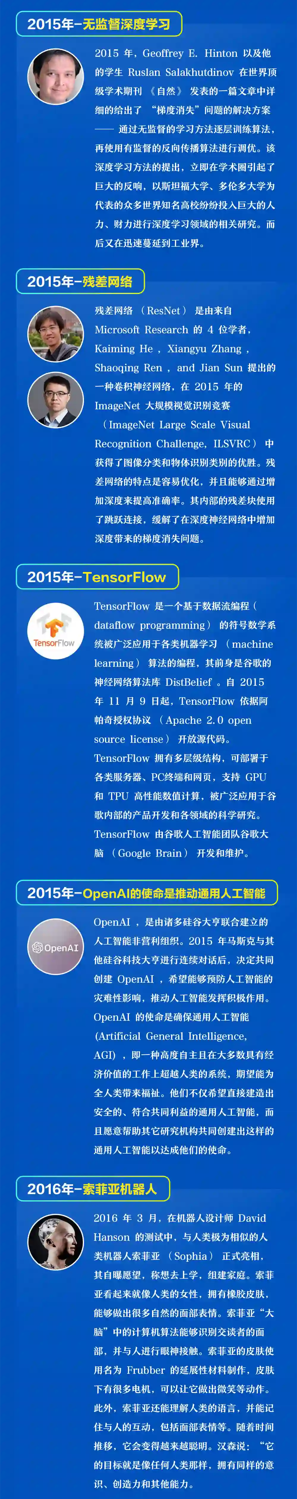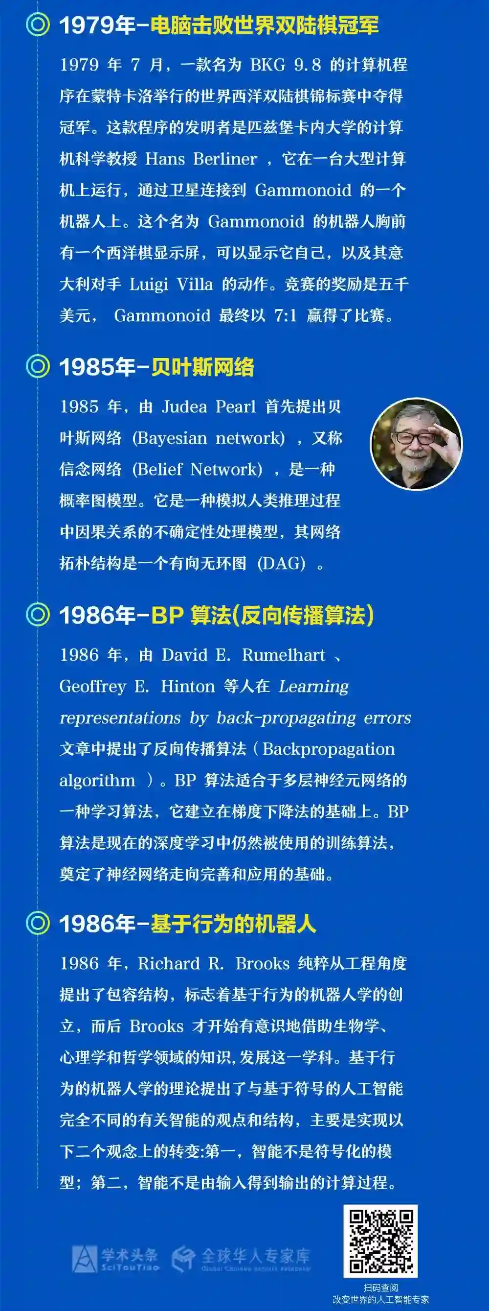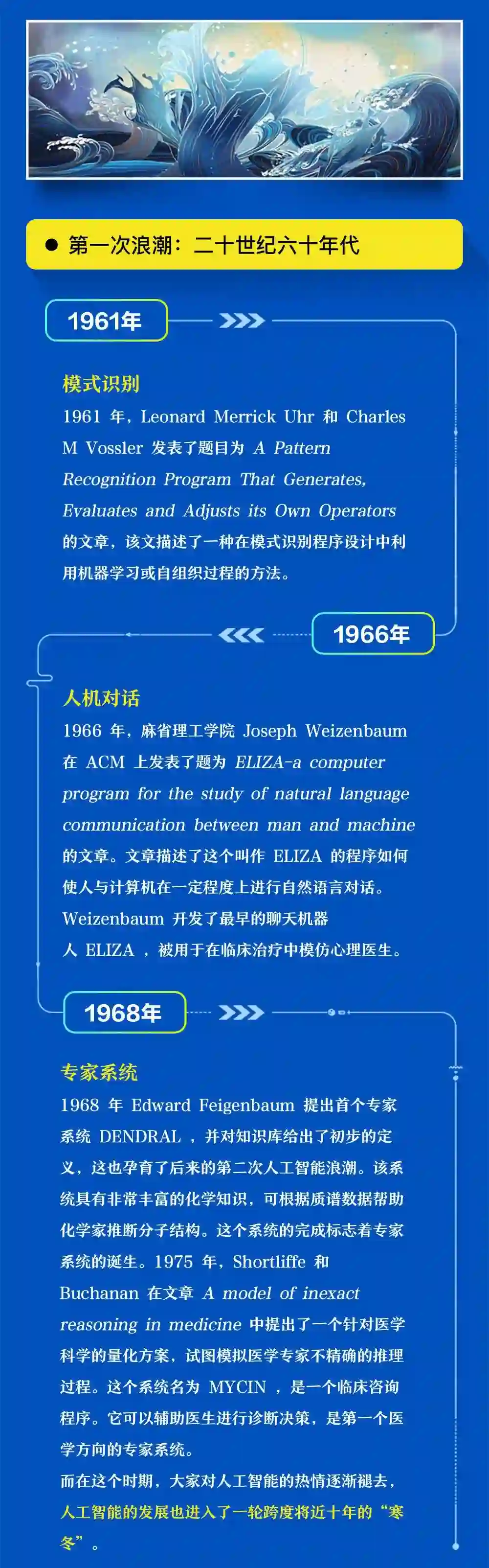 人工智能将融入每个人的生活,变得无处不在。虽然任何技术的发展都会有高峰和低谷,在漫漫人工智能发展长河中,应保持乐观也保留理智。我们相信未来人工智能必将发挥长处,造福人类生活,促进经济发展。 最后,学术头条向那些致力于人工智能发展的一代又一代创新者们致敬。科技发展的背后离不开推动创新的人们,我们也期待更多年轻人,投身到科技改变世界的浪潮中。 参考文献: 1. Jie Tang, Jing Zhang, Limin Yao, Juanzi Li, Li Zhang, and Zhong Su. ArnetMiner: Extraction and Mining of Academic Social Networks. (https://www.aminer.cn/pub/53e9a5afb7602d9702edacce/arnetminer-extraction-and-mining-of-academic-social-networks) In Proceedings of the Fourteenth ACM SIGKDD International Conference on Knowledge Discovery and Data Mining (SIGKDD'2008). pp.990-998.2. C. E. Shannon, "XXII. Programming a computer for playing chess," Philosophical magazine, vol. 41, no. 314, pp. 256–275, 1950.3. AM Turing. Solvable and Unsolvable Problems[J]. B.j.copeland, 1955, 31.4. Minsky M . A Framwork for Representing Knowledge[J]. The Psychology of computer vision, 1975.5. Weizenbaum, Joseph. ELIZA—A Computer Program For the Study of Natural Language Communication Between Man And Machine[J]. Communications of the Acm, 1983, 9(1):36-45.6. Kingma D P , Welling M . Auto-Encoding Variational Bayes[J]. 2014.7. Devlin J , Chang M W , Lee K , et al. BERT: Pre-training of Deep Bidirectional Transformers for Language Understanding[J]. 2018.8. Haenlein M, Kaplan A. A brief history of artificial intelligence: On the past, present, and future of artificial intelligence[J]. California management review, 2019, 61(4): 5-14.9. 史忠植. 高级人工智能[M]. 科学出版社, 2011.10. 顾险峰. 人工智能的历史回顾和发展现状[J]. 自然杂志, 2016, 38(003):157-166.11. 尼克. 《人工智能简史》[J]. 科普创作, 2018.12. 陈宗周. 《AI传奇-人工智能通俗史》[J]. 科普创作, 2018.13. https://www.aminer.cn/ai-history14. https://tech.sina.com.cn/roll/2020-07-16/doc-iivhvpwx5735932.shtml15. http://www.samr.gov.cn/samrgkml/nsjg/bzjss/202008/t20200805_320544.html16. https://en.wikipedia.org/wiki/Artificial_intelligence17. https://en.wikipedia.org/wiki/History_of_artificial_intelligence18. http://sitn.hms.harvard.edu/flash/2017/history-artificial-intelligence/19.https://www.livescience.com/47544-history-of-ai-artificial-intelligence-infographic.html(https://www.livescience.com/47544-history-of-a-i-artificial-intelligence-infographic.html)20. http://courses.cs.washington.edu/courses/csep590/06au/projects/history-ai.pdf21. https://www.aaai.org/ojs/index.php/aimagazine/article/view/1904/180222.https://www.technologyreview.com/s/602830/the-future-of-artificial-intelligence-and-cybernetics/23.http://www.bbc.com/future/story/20170307-the-ethical-challenge-facing-artificial-intelligence24.https://qz.com/1307091/the-inside-story-of-how-ai-got-good-enough-to-dominate-silicon-valley/25. https://zh.wikipedia.org/wiki/AlexNet#cite_note-quartz-126. http://www.dpkingma.com/27. https://en.wikipedia.org/wiki/Autoencoder28. https://en.wikipedia.org/wiki/Generative_adversarial_network29. https://en.wikipedia.org/wiki/Ian_Goodfellow30. https://poloclub.github.io/ganlab/31.https://www.technologyreview.com/2018/02/21/145289/the-ganfather-the-man-whos-given-machines-the-gift-of-imagination/32. https://www.jianshu.com/p/efda7876fe1c33. http://blog.itpub.net/29829936/viewspace-2217861/34. http://www.techwalker.com/2017/1225/3102138.shtml35. https://zhuanlan.zhihu.com/p/2035074336. https://blog.csdn.net/cao812755156/java/article/details/8959841037. https://blog.csdn.net/weixin_43624538/article/details/8504969938. http://kaiminghe.com/39.https://www.jiqizhixin.com/graph/technologies/1c91194a-1732-4fb3-90c9-e0135c69027e40. https://www.openai.com/41.Shortliffe EH, and Buchanan BG (1975). "A model of inexact reasoning in medicine". Mathematical Biosciences. 23 (3–4): 351–379. doi:10.1016/0025-5564(75)90047-4. 本文根据文献资料整理而成,时间仓促难免有误,如您有任何建议,欢迎联系:aiopen@aminer.cn。感谢您的关注与支持。 总策划:毛潇 文字编辑:赵雅琦、刘艺馨 图片编辑:刘静 排版:赵辰霞 编审:王新凯感谢所有对本文有贡献的专家技术顾问。 想要了解更多学术进展、前沿科技资讯,参与学术头条每日话题讨论,可以扫描二维码或搜索 AMiner308 添加学术君微信,对学术君说: “我想进读者群”, 即可进入读者群,不定期发福利~ 点击阅读原文,查看更多精彩! 喜欢本篇内容,请分享、点赞、在看