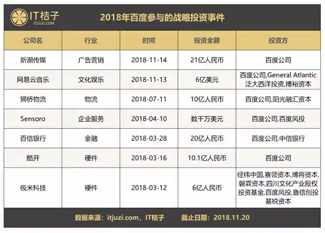 在文化娱乐领域,百度在 2018 年出手次数不多,但「不出手则已,一出手惊人」,投出诸如机器之心、梨视频、网易云音乐等一批脍炙人口的明星项目。