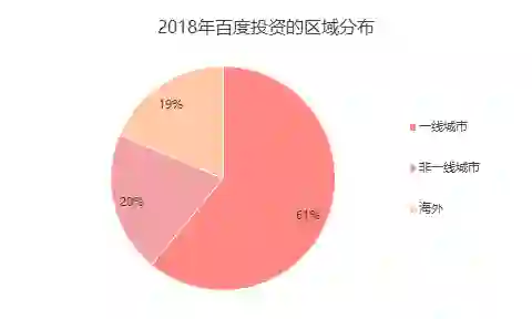 从百度在 2018 年的投资区域分布来看,一线城市(北京、上海、深圳、广州)占比超过六成,非一线城市以及海外投资占比均为两成左右。百度 2018 年在海外的投资事件数量为 11 起,其中美国 10 起,瑞士 1 起。