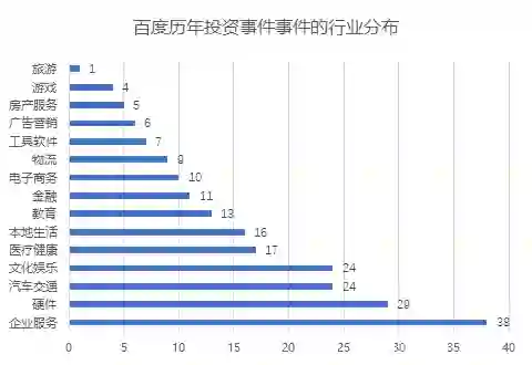 翻阅百度 200 多次投资行为,我们发现,企业服务、硬件、汽车交通和文化娱乐是百度「出手」次数最多的赛道。四大赛道占比超过一半,尤其是企业服务方向,到目前已有 38 次投资行为,占比接近 1/5。