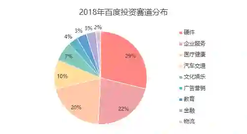 从行业分布来看,硬件、企业服务和医疗健康是百度重点布局的赛道,三大赛道投资事件占比超过七成。