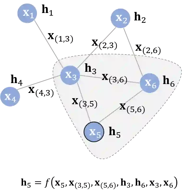 具体实现 在具体实现中, 其实通过一个简单的前馈神经网络(Feed-forward Neural Network)即可实现。比如说,一种实现方法可以是把每个邻居结点的特征、隐藏状态、每条相连边的特征以及结点本身的特征简单拼接在一起,在经过前馈神经网络后做一次简单的加和。