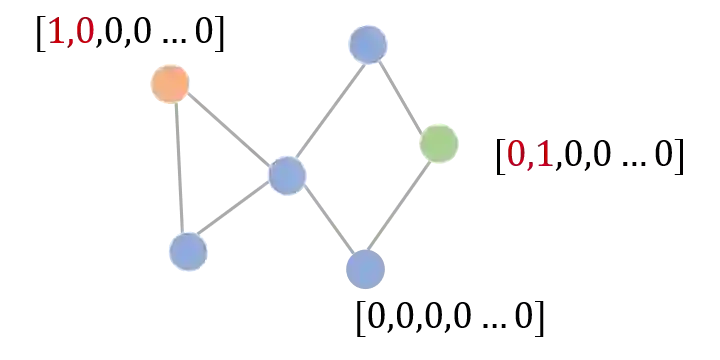 图中的红色结点即开始结点 ,绿色结点是我们希望判断的结点 ,我们这里称其为结束结点。那么相比于其他结点,这两个结点具有一定特殊性。那我们就可以使用第1维为1来表示开始结点,第2维为1来表示结束结点。最后在对结束结点分类时,如果其隐藏状态的第1维被赋予得到了一个非0的实数值,那意味着它可以到达。