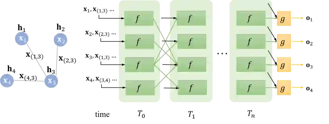 仔细观察两个时刻之间的连线,它与图的连线密切相关。比如说在 时刻,结点 1 的状态接受来自结点 3 的上一时刻的隐藏状态,因为结点 1 与结点 3相邻。直到 时刻,各个结点隐藏状态收敛,每个结点后面接一个 即可得到该结点的输出 。