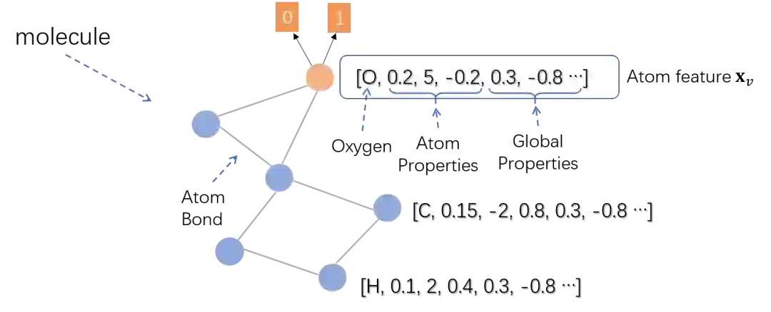 由于化合物的分类实际上需要对整个图进行分类,在论文中,作者将化合物的根结点的表示作为整个图的表示,如图上红色的结点所示。Atom feature 中包括了每个原子的类型(Oxygen, 氧原子)、原子自身的属性(Atom Properties)、化合物的一些特征(Global Properties)等。把每个原子看作图中的结点,原子键视作边,一个分子(Molecule)就可以看作一张图。在不断迭代得到根结点氧原子收敛的隐藏状态后,在上面接一个前馈神经网络作为输出层(即 函数),就可以对整个化合物进行二分类了。