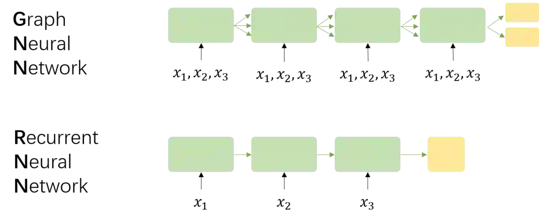 假设在GNN中存在三个结点 , , ,相应地,在RNN中有一个序列 。笔者认为,GNN与RNN的区别主要在于4点: