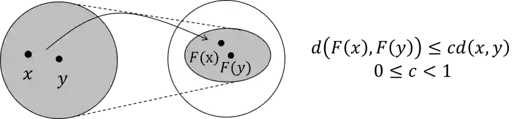 上图的实线箭头就是指映射 , 任意两个点 在经过 这个映射后,分别变成了 。压缩映射就是指,。也就是说,经过 变换后的新空间一定比原先的空间要小,原先的空间被压缩了。想象这种压缩的过程不断进行,最终就会把原空间中的所有点映射到一个点上。