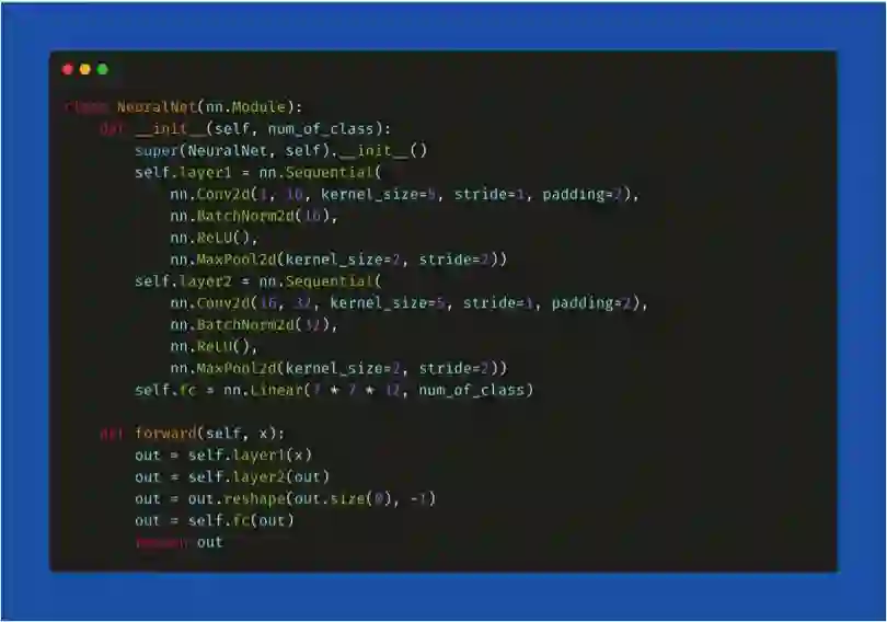 最后,我们声明一个变量模型并将其分配给定义的架构(model = NeuralNet())。