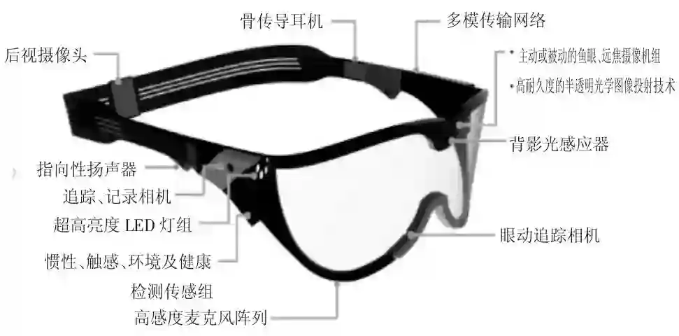 高通公司于近期发布了其布局已久的XR移动计算平台以及XR1芯片,公司XR亚太区负责人郭鹏认为,AR、VR或者MR的底层软硬件技术,其实很多都是相通的,尤其与芯片相关的支持技术以及软件开发包(Software Development Kit,SDK)[21]。 因此,XR技术的实现机制包含三种沉浸式技术的综合发展,如高通公司在2017年发布的XR报告中,提出了XR眼镜的概念图[22](见图2)。