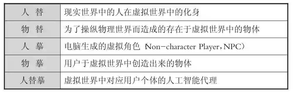 国内中山大学哲学系教授翟振明是较早提出扩展现实概念的学者,他认为从技术综合性和广度来讲,扩展现实是将互联网、物联网和混合现实技术结合起来技术形式;从哲学角度讲,扩展现实将是创造人类未来“虚实融合”的新世界模式,尤其强调在拓展现实中人类的自由意志活动。如表3所示,在其著作《有无之间:虚拟实在的哲学探险》中,他着重阐释了虚拟现实中的“人替”、“物替”以及扩展现实中的“人摹”、“物摹”和“人替摹”[18]。其构想的未来扩展现实概念,与近年流行的数字孪生相接近。所谓数字孪生(Digital Twin)是一种集成多物理、多尺度、多学科属性,具有实时同步、忠实映射、高保真度的特性,能够实现物理世界与信息世界交互与融合的技术手段[19]。