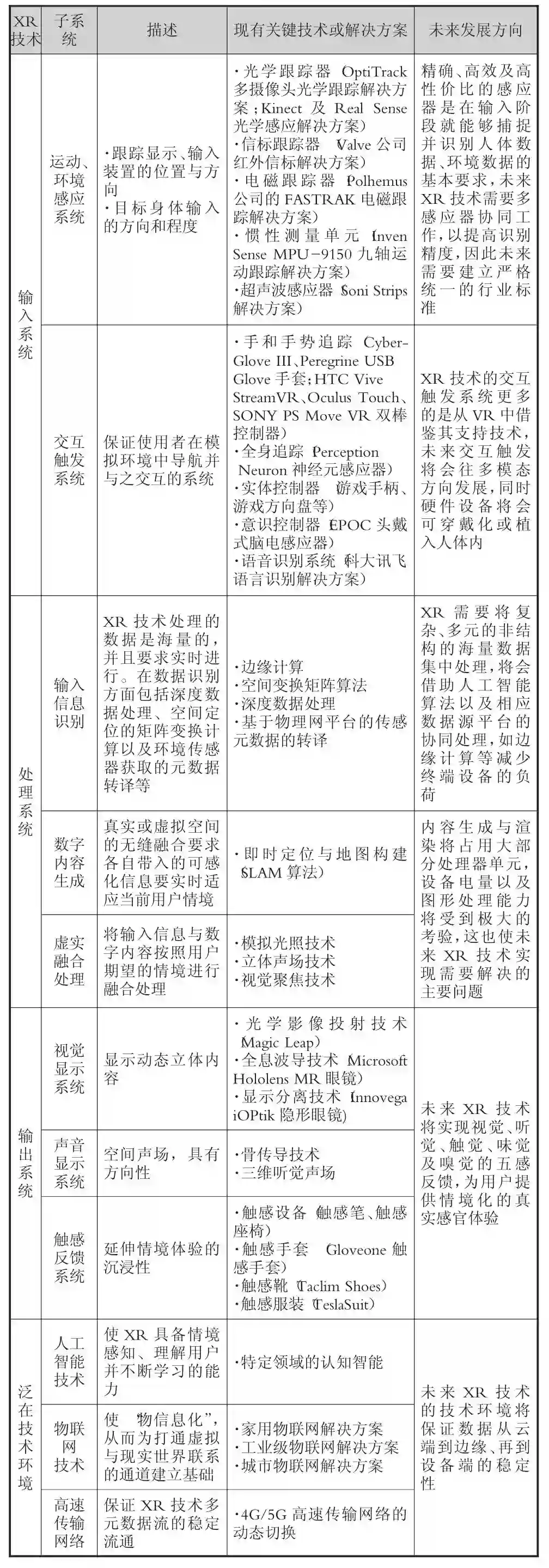 MR对于VR的发展,表现在能够将现实世界中的内容代入虚拟空间,实现虚拟环境的即时生成与构建,并保持与现实空间的协同,以提高用户体验的自由度。三者主要的技术区别如表2所示。微软公司的HoloLens,以及Magic Leap公司所研发的混合现实设备,能够代表现阶段增强现实、虚拟现实技术的融合情况。但其仍是以视觉为主要感知方式的显示设备,在体验方面仍有局限之处,这也为扩展现实技术的提出,奠定了基础。