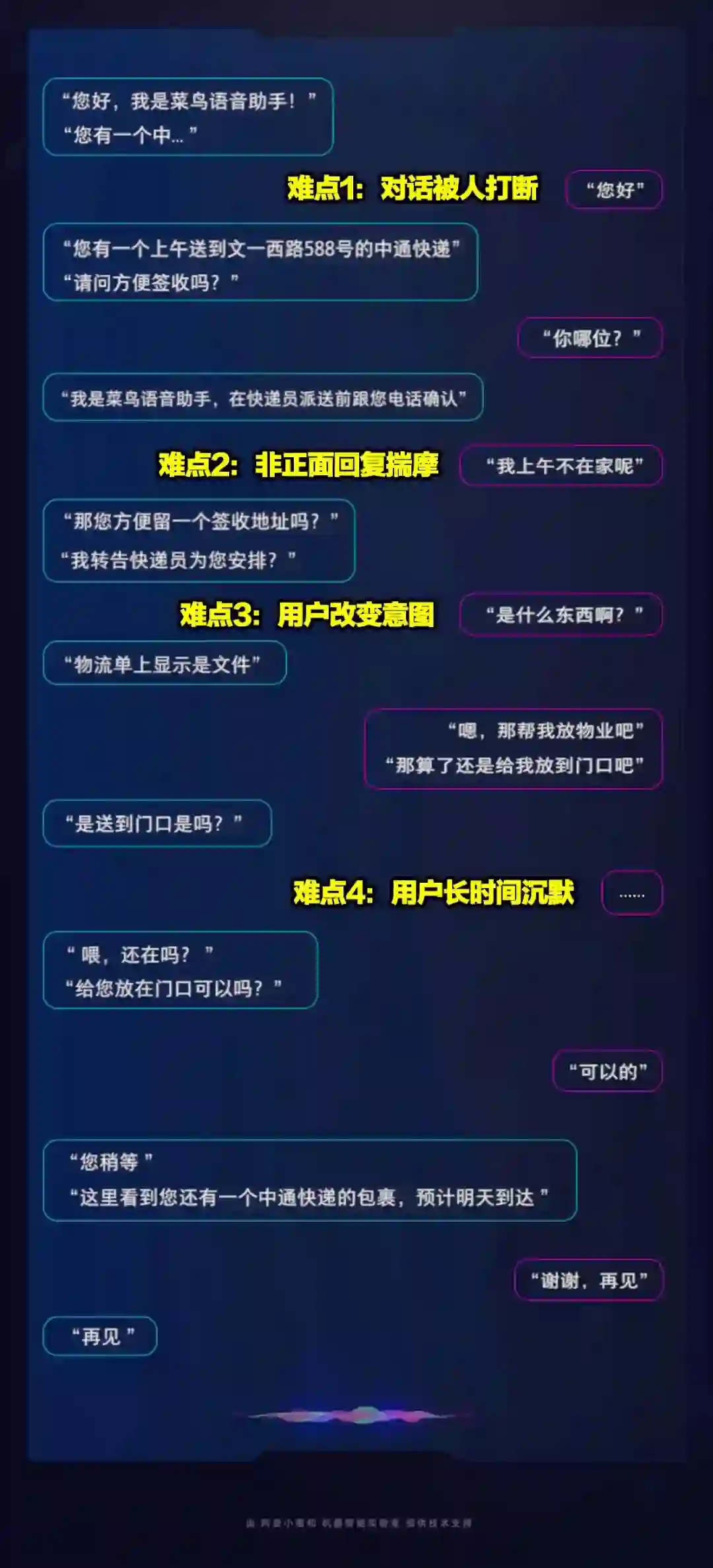 中国物流快递业高速发展,平均每个快递员每天大约要送近200个包裹。自从有了语音AI助手,快递员每天节约至少3小时电话时间。语音助手可以自主完成与消费者的派前电联,询问消费者要将包裹放在什么地方。