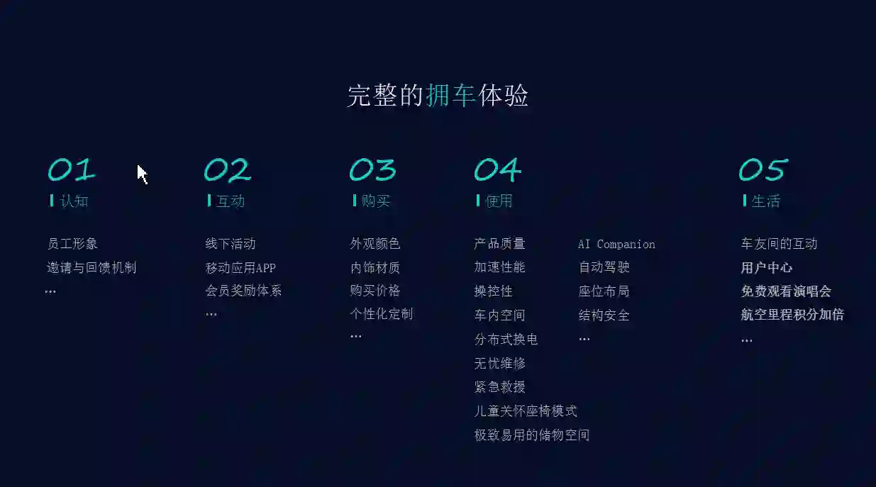 我们将汽车的用户体验分成四大方面,大体上就是我们对用户变革方向的一个思考。