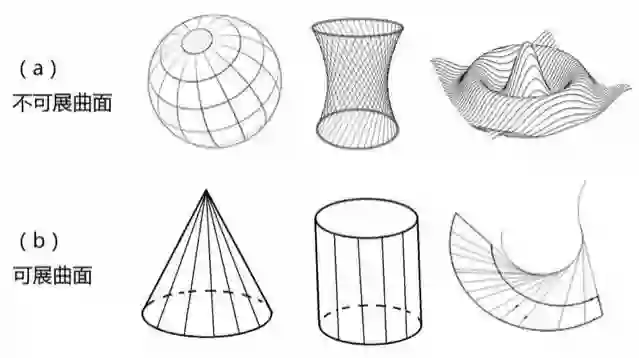 曲面的形状变幻无穷,按照我们感兴趣的性质,可以将其分为两大类:可展曲面和不可展曲面。初看图2a和图2b所画出的曲面,也许你看不出这两类图形有何区别。它们都是从三维空间看到的形状。不管可展还是不可展,看起来不都是“弯曲的”、“不平的”吗?然而,如果你再仔细观察,就会发现,可展曲面的“弯曲”与不可展曲面的“弯曲”有着本质的区别。简单地说,可展曲面在本质上是“平的”,它们可以被展开成一个平面。比如,将图2b所示的锥面,用剪刀剪一条线直到顶点,就可以没有任何皱褶地将它平摊到桌子上。柱面也可以沿着与中心线平行的任何直线剪开,成为一个平面。