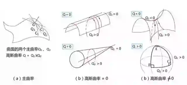 曲面弯曲的内蕴性最早被“数学王子”高斯注意到,后为黎曼所发展,并推广到大于3的n维流形。因而,黎曼几何是一种内蕴几何。换言之,内蕴性指的是曲面(或曲线)不依赖于它在三维空间中嵌入方式的某些性质。也就是说,它是曲面某些内在的、本质的几何属性。高斯用高斯曲率——两个主曲率的乘积,来表征曲面的这种属性(图3a)。如果一个曲面的高斯曲率为0,说明它本质上是平的,是可展曲面,如图3b所示。如果一个曲面的高斯曲率不为0,说明它本质上是不平的,是不可展曲面,如图3c所示。
