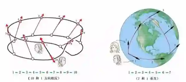 假如将女孩面对的方向用一个箭头(矢量)来表示。图4a所示的是一个矢量在莫比乌斯带上的平行移动,当矢量从位置1出发,沿着数字1、2、3……一直移动到10,也就是回到原来的出发位置时,得到的矢量和原来的反向。图4b中所示是球面上的平行移动,当矢量从位置1出发,沿着数字1、2、3……一直移动到7,也就是回到原来的出发位置时,得到的矢量和原来的矢量垂直。