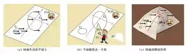 有一天,来了一个3维世界的小生物“阿三”。阿三看中了阿扁生活的这张纸,并且灵感突发,把这张纸剪去了一个角。比如说,像图5b中图所画的情形,剪去了一个45度的角,然后将剩余图形的两条剪缝黏在一块儿,做成了一个图5c所示的锥面。阿扁是个2维小爬虫,他看不见阿三,也感觉不到阿三的存在,更不可能知道阿三对他的世界干了些什么。