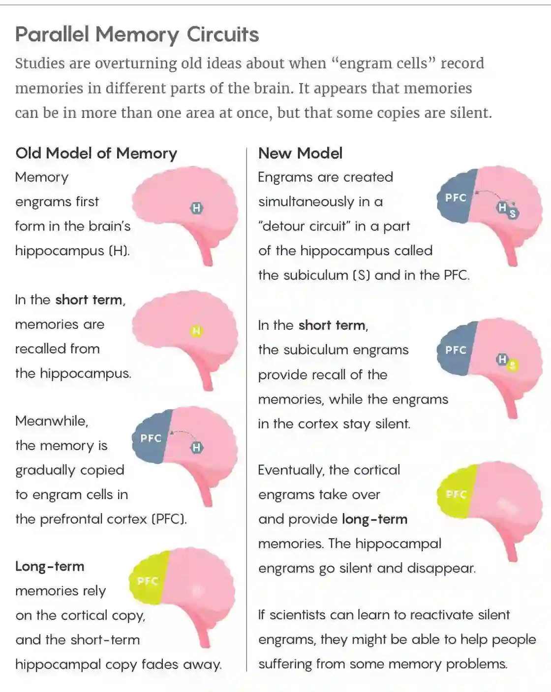 在过去的几十年中,神经科学领域最为广泛接受的记忆模型,是首先立刻在海马区形成短期记忆,然后转移到前额叶皮层进行长期存储。但是利根川进的团队最近在《科学》上报道,新的记忆会在这两个脑区同时形成。
