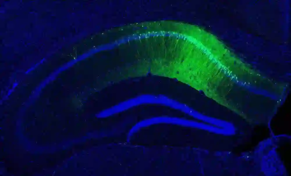 转染了光敏通道蛋白后,海马中的印记细胞发出绿色荧光,表示它们储存了一段短时记忆,来源 Dheeraj Roy, Tonegawa Lab/MIT