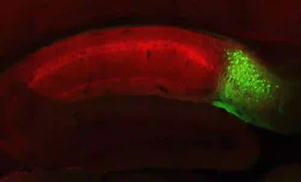 研究发现,海马神经元(红色)对新记忆的形成是必要的,但负责回想记忆的是海马下托部分的神经元(绿色)。来源:Dheeraj Roy/Tonegawa Lab, MIT