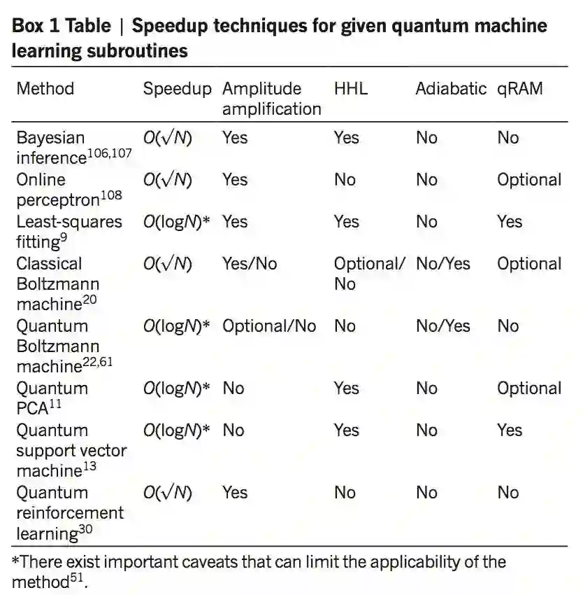 在本文的各处都会看到,机器学习的量子算法展示了量子加速。例如,几个量子基本线性代数程序(BLAS)——傅里叶变换,寻找特征向量和特征值,求解线性方程 ——与其最著名的经典算法对应物相比都展示了指数量子加速。这种量子基本线性代数程序(qBLAS)的加速可转化为各种数据分析和机器学习算法的量子加速,包括线性代数,最小二乘拟合,梯度下降,牛顿法,主成分分析,线性、半定性和二次规划,拓扑分析和支持矢量机。 同时,诸如量子退火器和可编程量子光学阵列等专用量子信息处理器与深度学习架构也有很好的匹配。 尽管目前还不清楚这种潜力可被实现的程度,但我们有理由认为,量子计算机可以识别出经典计算机无法在数据中识别的模式。