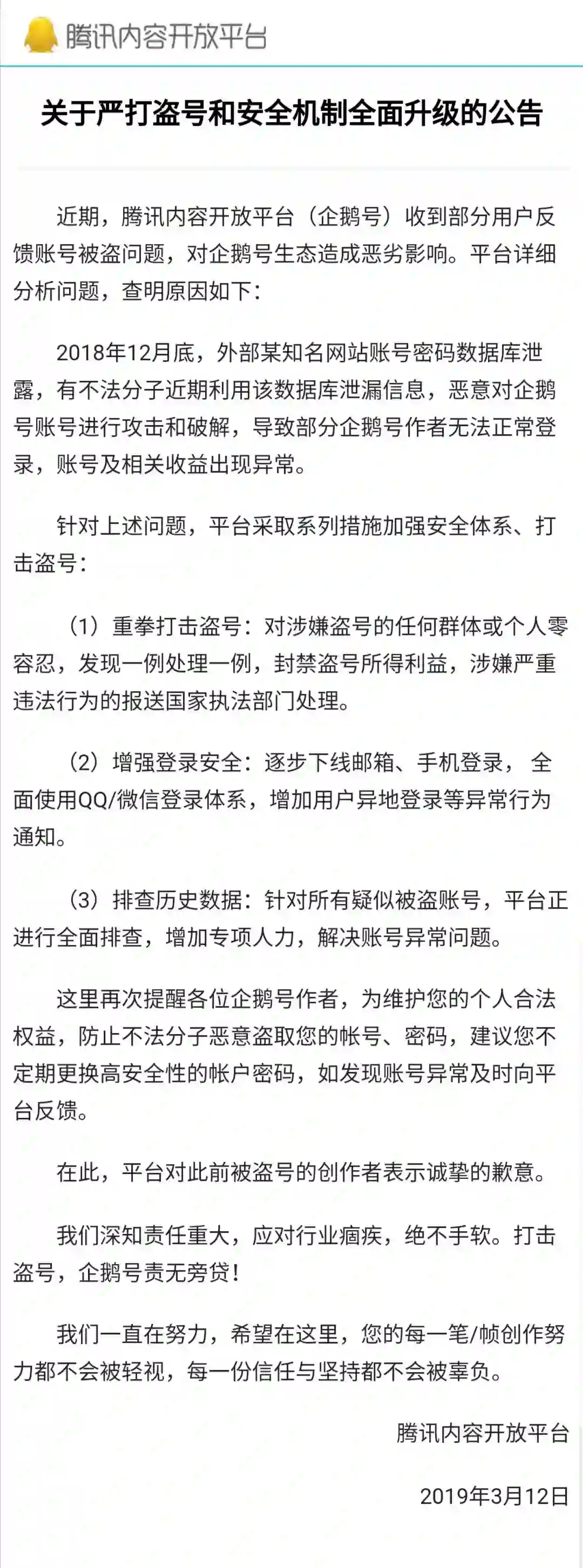 看出端倪来了吧!露露这些狗血八卦标题党的文章,在企鹅好两个月就获得了7万5的收益,而此前三木踏踏实实撰写的科技人文稿收益呢,为0。是不是很意外,所以这件事都惊动了当家马化腾,有消息称马化腾已经亲自过问。而企鹅号也在昨晚21:03分发表了 《关于严打盗号和安全机制全面升级的公告》原文如下: