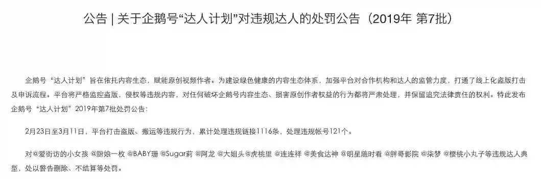 (以下为企鹅号处罚公示)