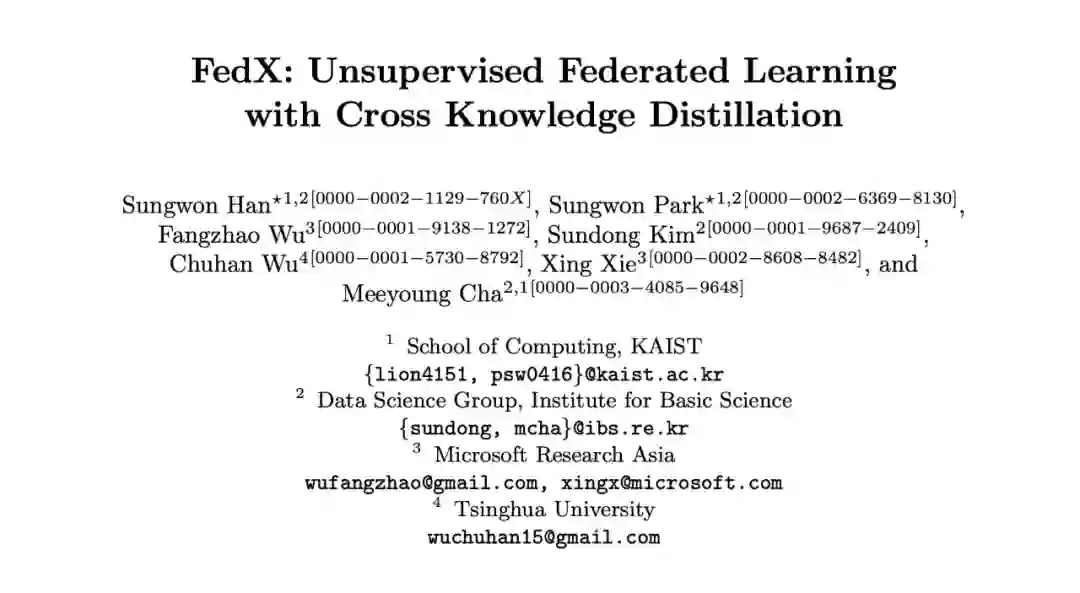 提出了无监督的联邦学习算法 FedX,使用了局部与全局两个阶段的蒸馏来学习不同客户端的数据表示;两阶段的知识蒸馏能够发现有意义的本地数据向量表示,同时通过全局的知识蒸馏消除不同客户端之间的偏差;