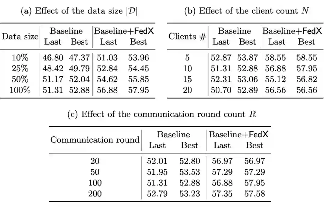 作者也进行了一系列的有效性实验,以证明 FedX 在不同场景,不同设定下的有效性。