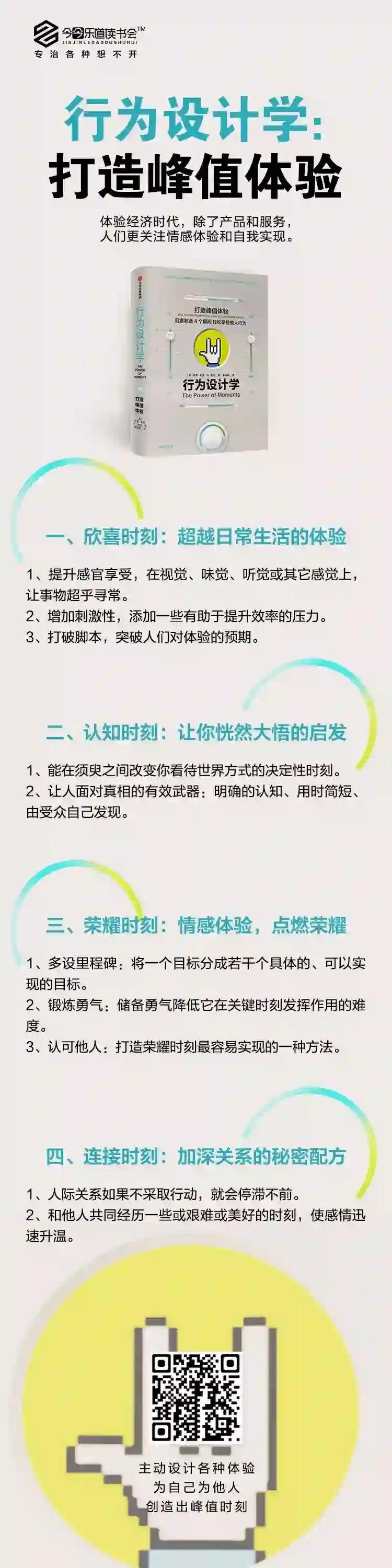 利用好“峰终定律”,为顾客打造峰值时刻,可以为商家带来巨大的商业利益,掌握这些套路,并用来经营个人生活,也会取得令人意想不到的效果。那么,什么是“峰终定律”?如何把“峰终定律”运用在生活和工作中?本书《行为设计学:打造峰值体验》专门来解决这个问题的。这本书的作者是斯坦福大学商学院教授奇普·希思,以及杜克大学社会企业发展中心高级研究员丹·希思,希思兄弟通过研究发现,那些令人难忘的峰值时刻大致包含四种元素:欣喜、认知、荣耀和连接。当我们面对生命中的转变、里程碑时刻和低谷事件时,会本能地渴望关注和重视。这也是体验设计者最值得用心投资的节点,是搭建信任、尊重、责任和忠诚度的最佳时机。结合以上4种体验,凸显转变时刻,纪念里程碑事件,填平低谷感受,就抓住了体验思维的核心。