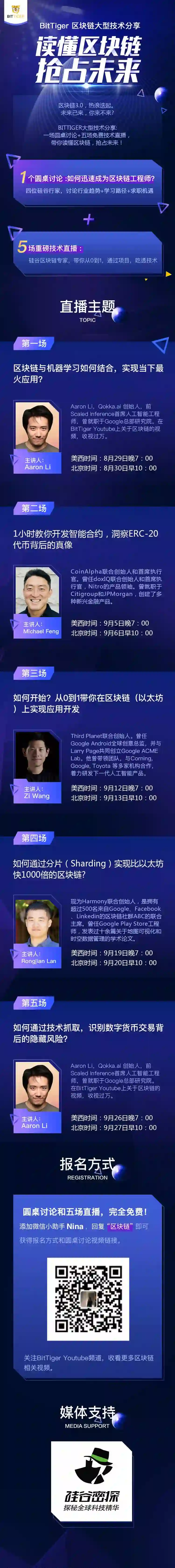 黄金9月,BitTiger携手硅谷区块链顶尖专家,推出大型公开技术分享系列活动,一场圆桌讨论+五场技术直播,带你读懂区块链。