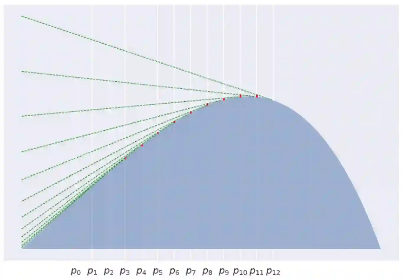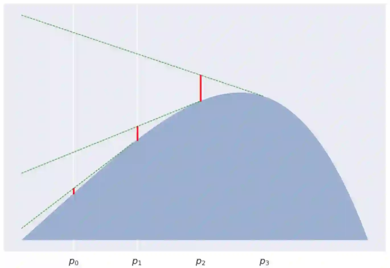 严格的说, 正是由于这个山丘是个凸函数, 所以 Quentin 并不能直接看到 Poppy, 除非她会跳! Bregman散度描述的就是 Quentin 跳起来后, Poppy 也不会看到她的最大安全距离。可见山丘越陡, 即曲率越大, Poppy 跳起来看不到 Quentin 的距离范围也就越大。