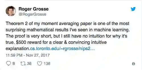 【AI科技大本营导读】Hinton大神CSC321课程的“接班人”,加拿大多伦多大学副教授http://www.cs.toronto.edu/~rgrosse/Roger Grosse在Twitter上公布了一项悬赏金额500刀的挑战,为了找出一个能证明他在moment averaging中所提出的定理2的“世外高人”:
