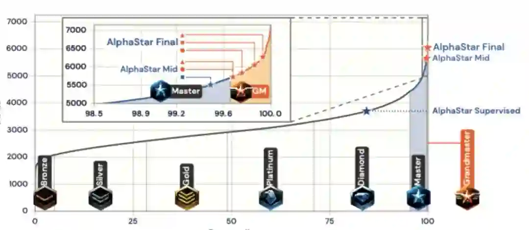 这个新版的 AlphaStar 一共经过了 44 天的训练,然后在星际 2 天梯上(在暴雪的帮助下)用各种各样的马甲进行比赛,以免被玩家轻易发现。最终达到了星际 2 欧服的「Grandmaster」段位,以及所有活跃玩家的前 0.15% 排名。