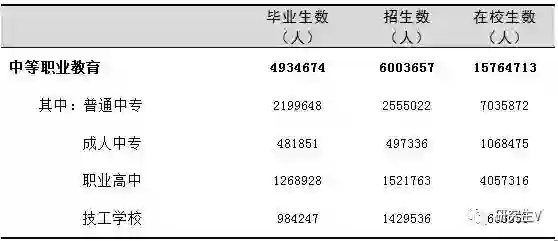 中等职业学校1.01万所,比上年减少151所。其中,普通中等专业学校3339所,比上年增加17所;成人中等专业学校1032所,比上年减少65所;职业高中3315所,比上年减少116所;技工学校2392所,比上年增加13所。