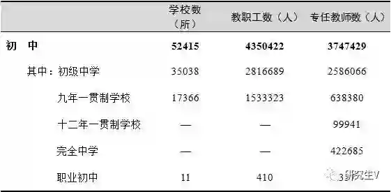 初中教职工435.04万人,比上年增加15.67万人,增长3.74%;专任教师[11]374.74万人,比上年增加10.84万人,增长2.98%。初中专任教师学历合格率99.88%,比上年提高0.02个百分点。生师比12.88:1。