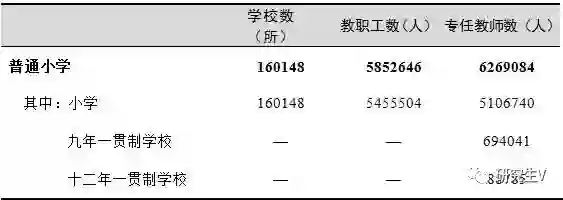 小学教职工[7]585.26万人,比上年增加12.01万人,增长2.10%;专任教师[8]626.91万人,比上年增加17.72万人,增长2.91%。专任教师学历合格率[9]99.97%,与上年持平。生师比16.85:1。