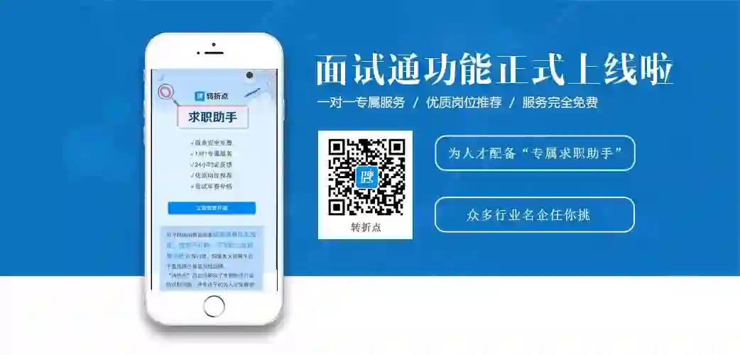 转折点面试通功能上线啦,为人才配备专属的求职客服,免去一份份投简历的繁琐过程,客服会根据您的求职意向给您匹配大量岗位,众多的行业名企任你挑选,而且,服务完全免费,是真的完全免费哦!