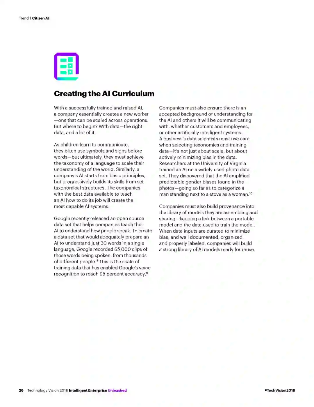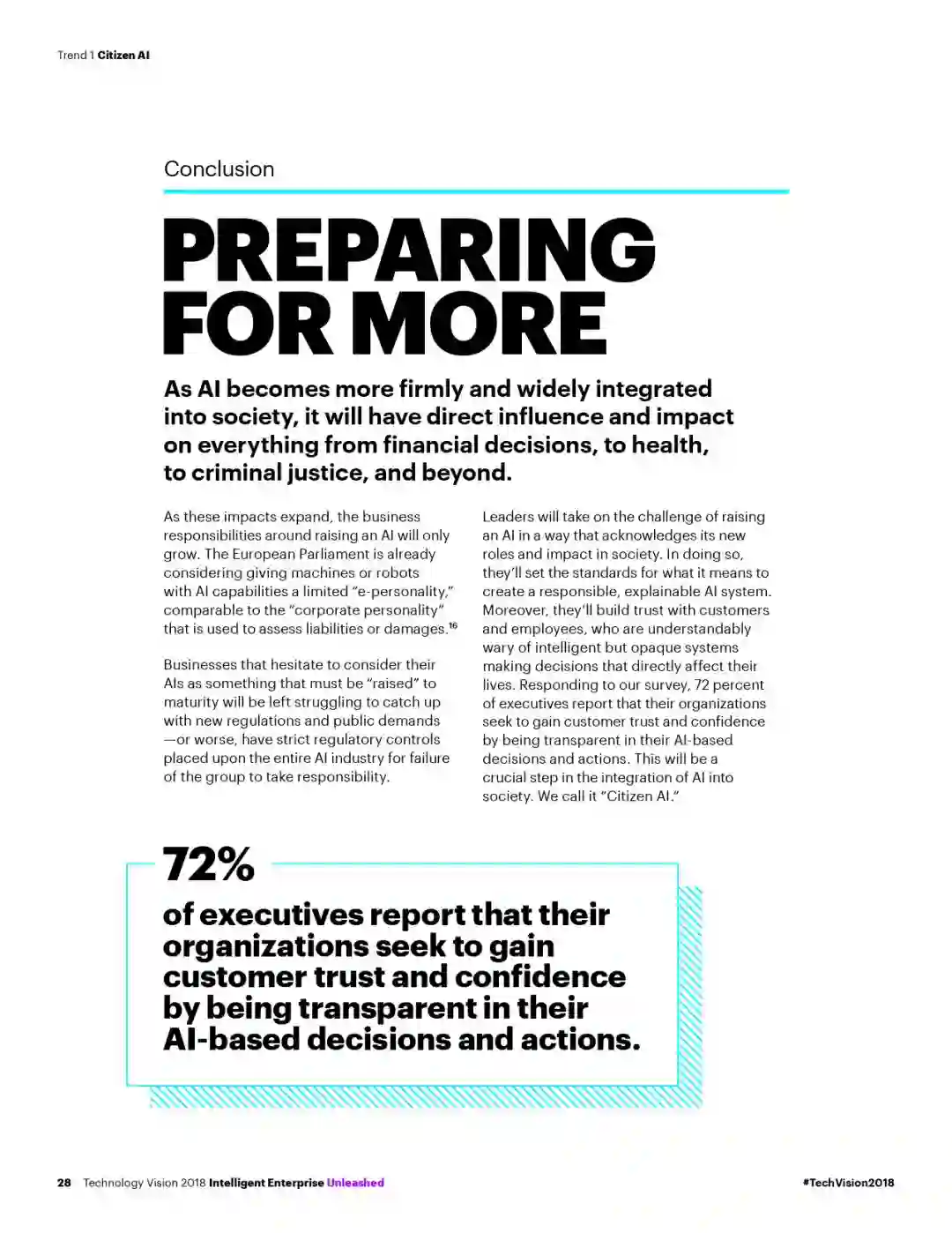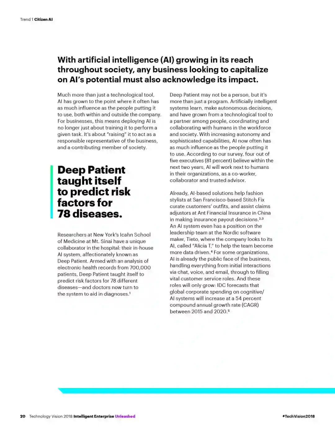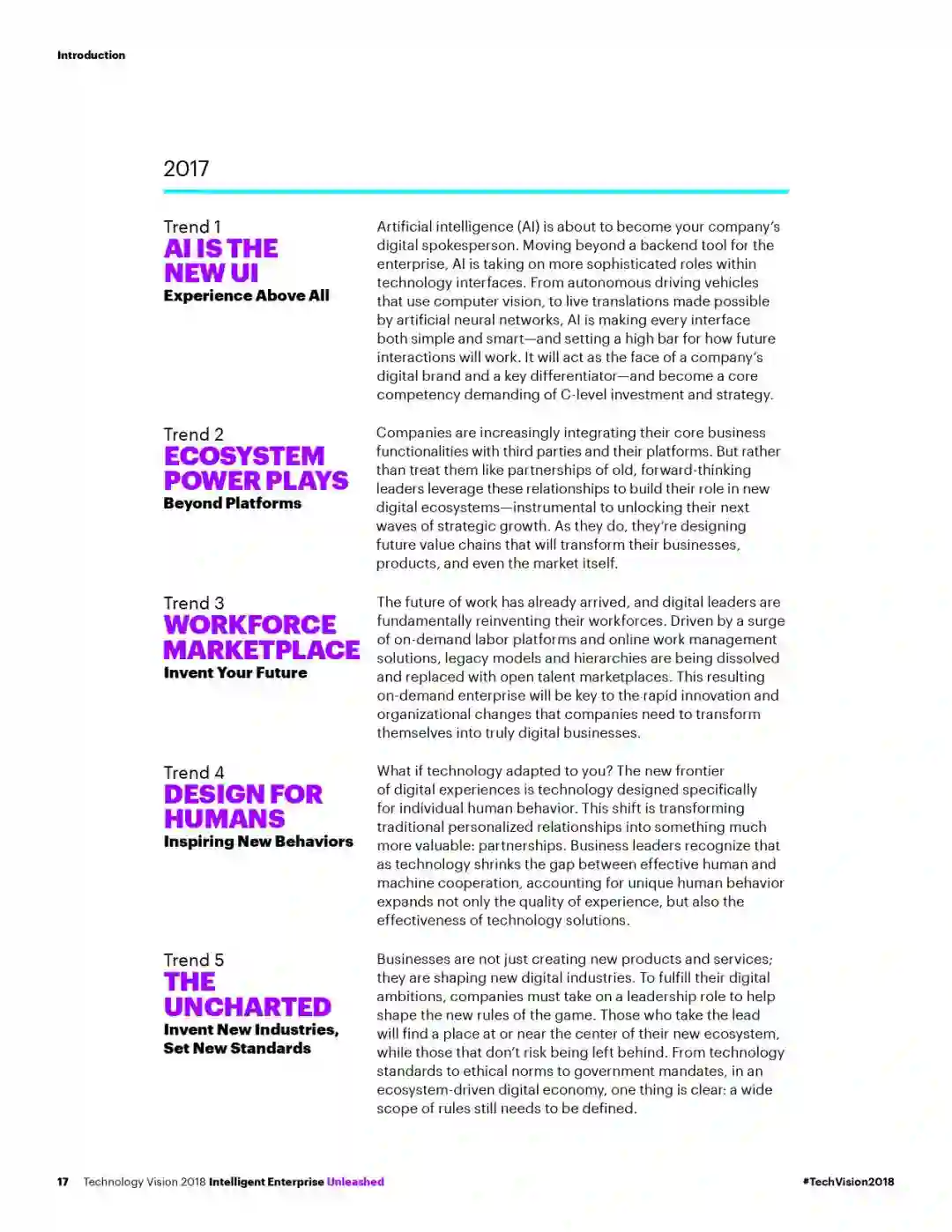 埃森哲(纽交所代码:ACN)最新发布的《埃森哲技术展望2018》报告指出,随着人工智能(AI)和其他技术的飞速发展,智能企业层出不穷,并正融入人们的生活。但若要充分把握增长机遇,对社会产生积极影响,企业需要发挥领导力,加快构筑信任生态,承担更多责任。该年度报告预测了未来三年内将给企业带来颠覆性影响的重要技术趋势。