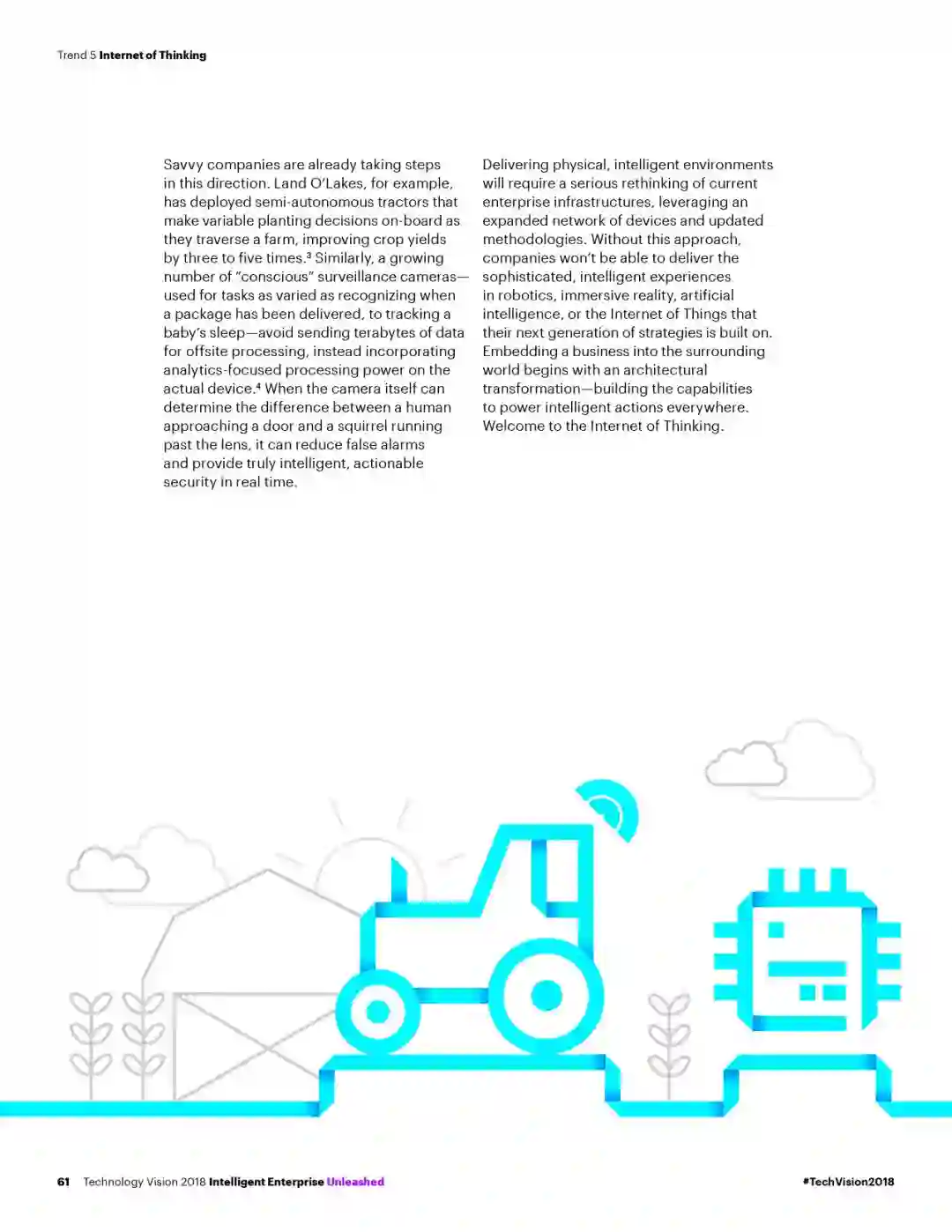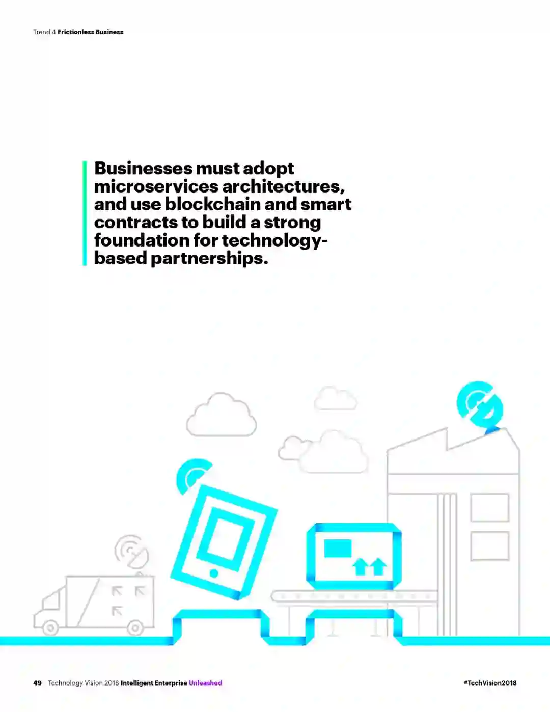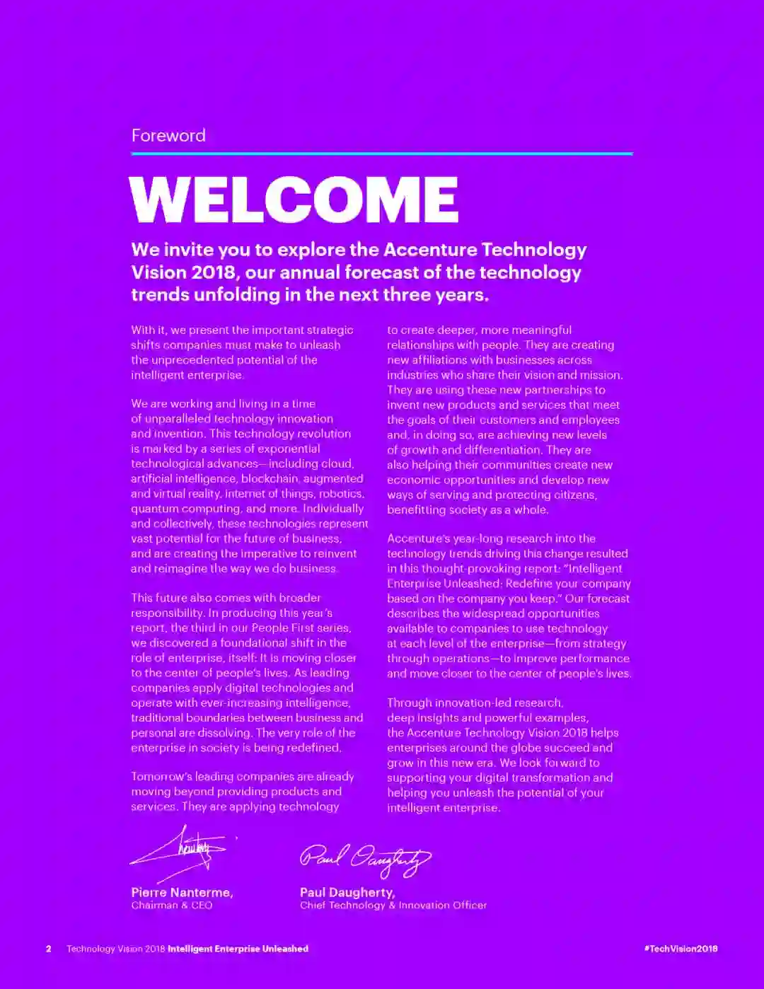 本年度《技术展望》报告的主题为“智能企业:共建新契约,共赢无边界”。报告指出,AI、先进的数据分析和云计算等新技术的迅猛发展,不仅使得企业能打造出创新的产品与服务,也进一步改变了人们工作和生活方式。随之而来,技术的发展也正在转变企业与客户、商业伙伴之间的关系。